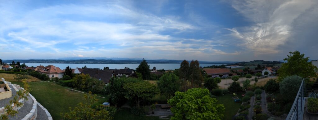 Für zwei Nächte haben wir uns in Lugnorre FR im Bed & Breakfast «Falling waters» einquartiert. Unser Zimmer war sehr grosszügig, die Aussicht von der Terasse wunderbar. Leider konnten wir das Alpenpanorama nur erahnen, weil das Wetter nicht ganz mitgespielt hat.