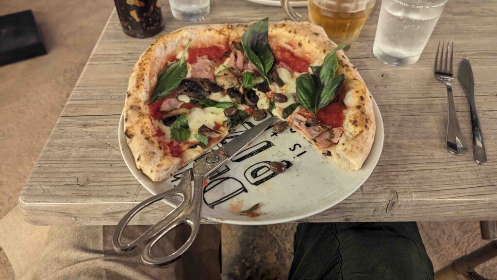 Nach dem Apéro war die Euphorie gross. Wir führen der Küste entlang Richtung Süden, einen gut bewerteten Stellplatz anpeilend. Da angekommen um 18:30 war die Reception geschlossen. Online-Buchung oder Checkin war nicht möglich, der Nachwächter war auch noch nicht da. Kurz zusammengefasst: Wir konnten nicht da übernachten. Ergo ging es wieder zurück. Wir landeten in Cargèse auf dem Camping Mandriale. Schon beim ersten Durchfahren des Dorfes hatten wir eine Pizzeria entdeckt, die wir, nach dem der Camper stand, dann auch besuchten.