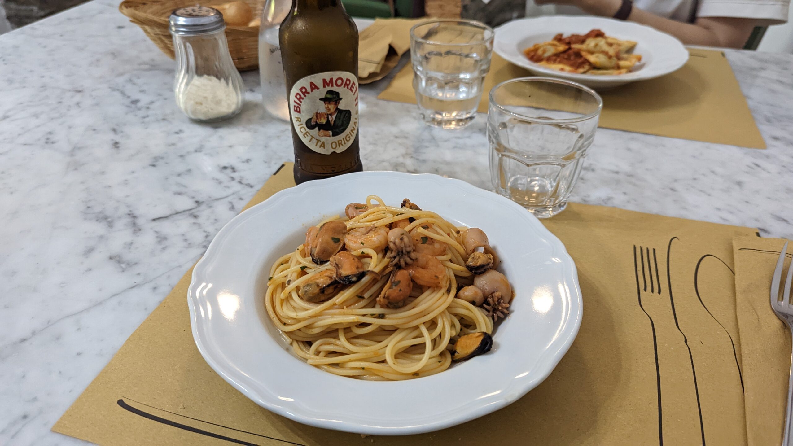 Bis dahin blieb reichlich Zeit. Nach einem ausgedehnten Bummel durch La Spezia fanden wir den Weg in die Osteria Da Gianni. Im Führer steht, es sei ein schnörkelloses Lokal, das sich nie irgendwelchen kulinarischen Modeströmungen unterworfen habe. Als Primo wurden zwei Alternativen vorgeschlagen, als Secondo drei. Mehr braucht es nicht. Alles war ausgezeichnet, weil schnörkellos einfach.